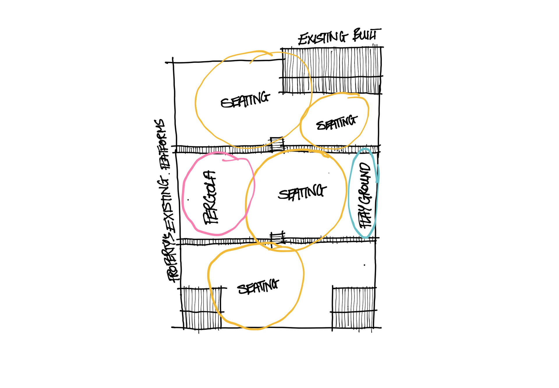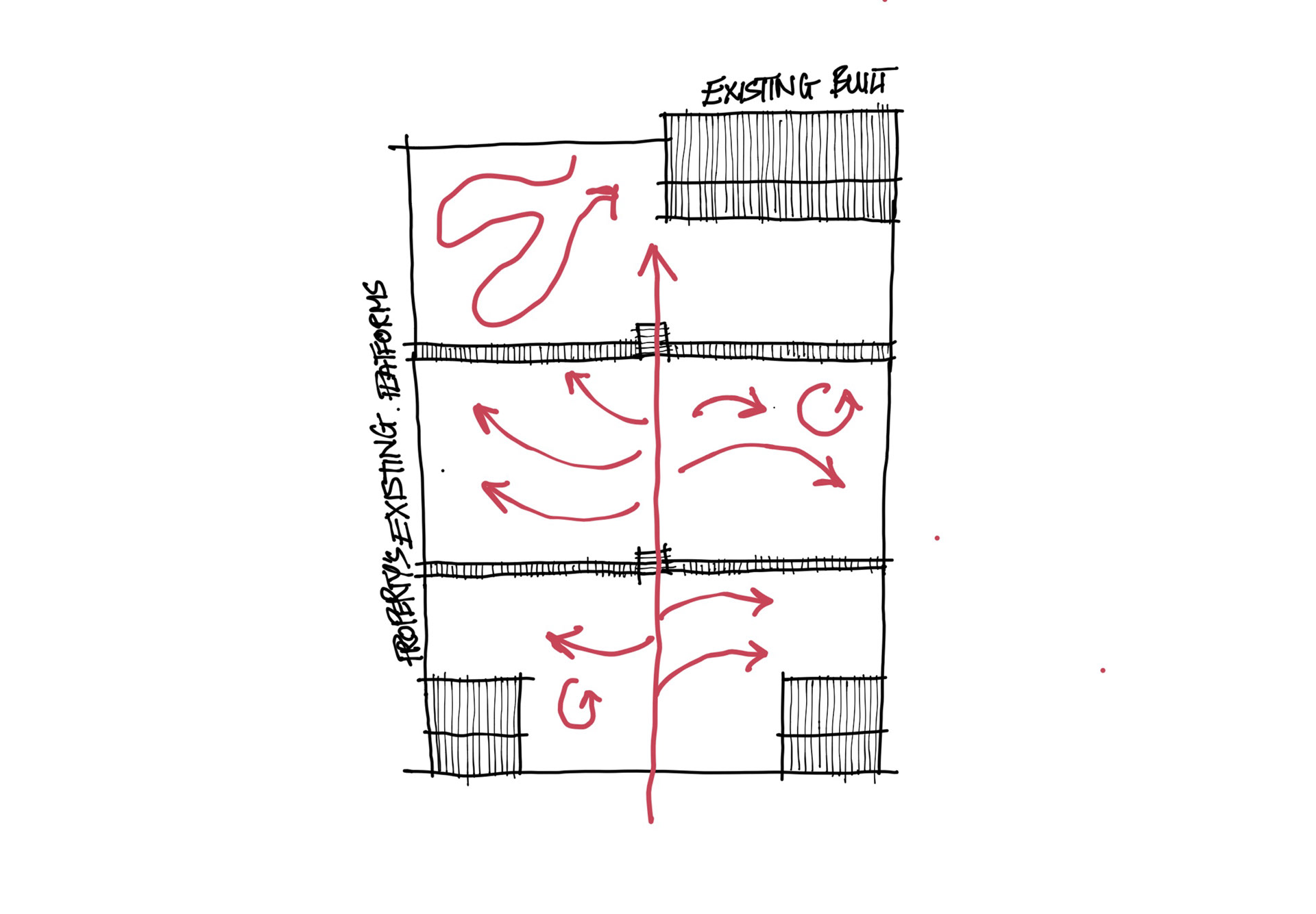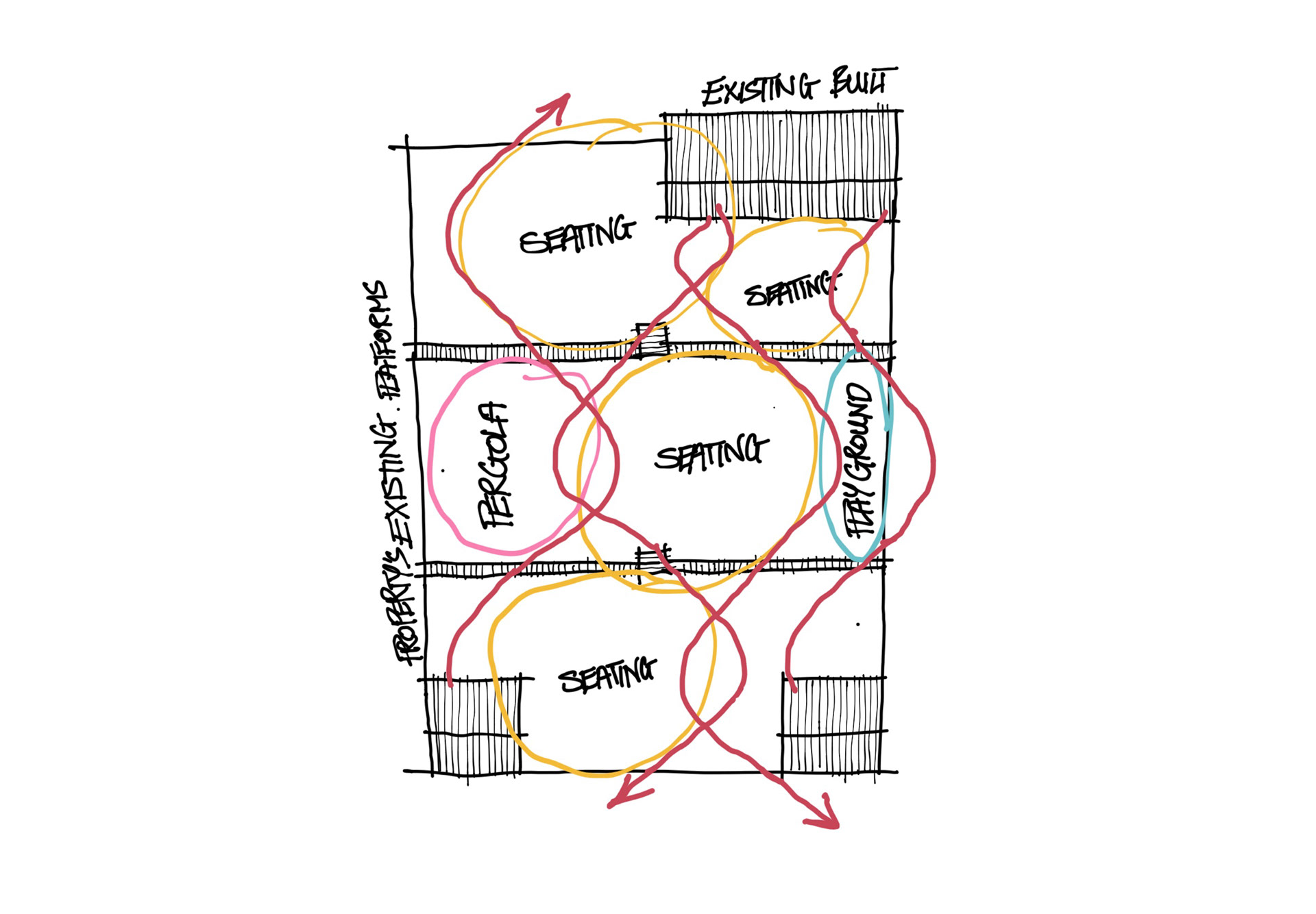 With an existing situation of brick works laid out, creating three elevated platform with a direct in a stiff direction ignoring the rest of the area. In order to reach different parts of the area, the creation a controlled organic path was invoked just like the river since the property is a waterfront on it.